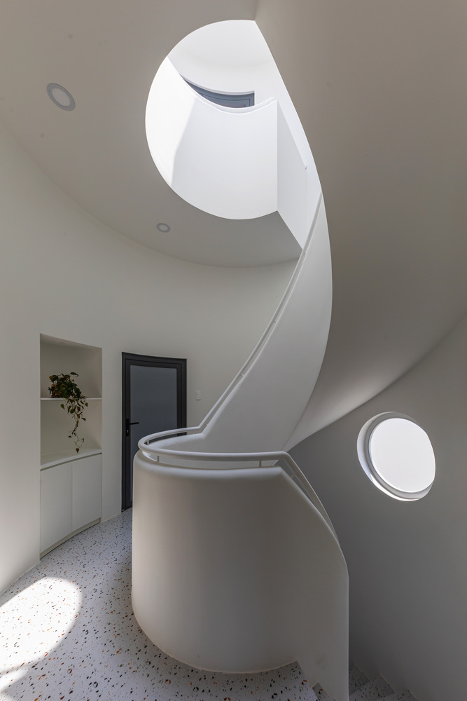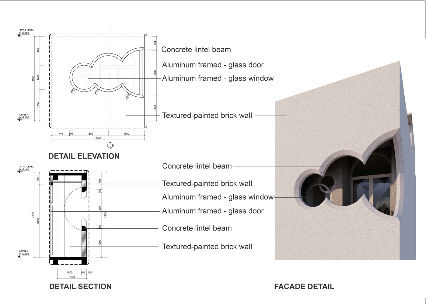 Cuối cùng, một loạt các ô cửa sổ và cửa mở hình tròn và hình đám mây ở cả mặt tiền phía trước và phía sau, cũng như giếng trời trên mái nhà, mang đến tầm nhìn lý tưởng, ánh sáng ban ngày và thông gió tự nhiên, đồng thời đảm bảo sự riêng tư và thoải mái. Hơn nữa, sự tương tác giữa đặc và rỗng, ánh sáng và bóng tối được tạo ra bởi những ô cửa mở độc đáo này và không gian nội thất cong của Cloud House ngụ ý mạnh mẽ về một cái nhìn thoáng qua về thiên nhiên giàu trí tưởng tượng, gợi lên cảm giác kỳ diệu và để những người ở đó trải nghiệm cảm giác năng động khi họ đang lang thang giữa những đám mây luôn thay đổi vượt ra khỏi sự hối hả và nhộn nhịp của thành phố.