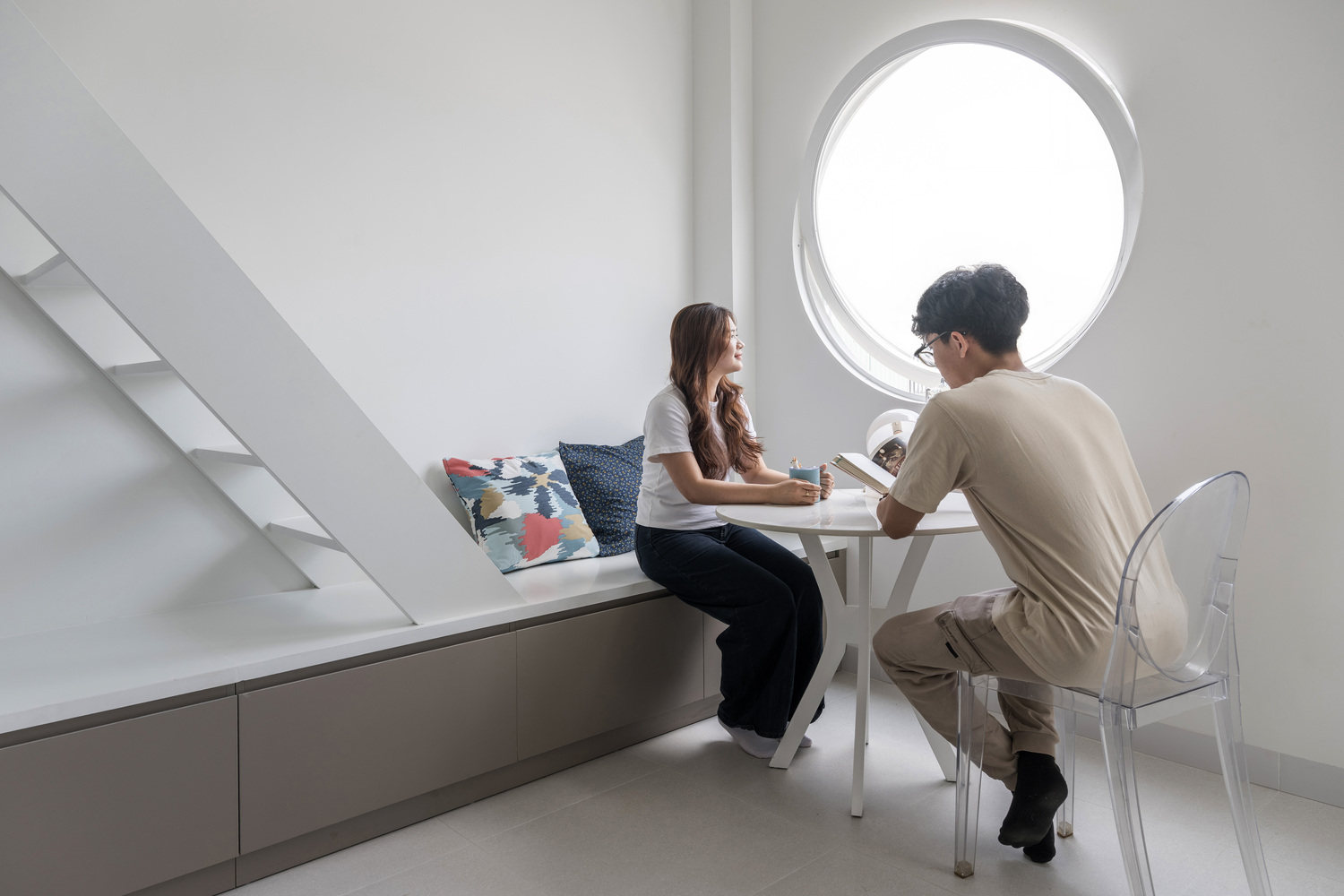 Đầu tiên, sáu phòng suite theo phong cách gác xép và hai phòng studio tiêu chuẩn được sắp xếp gọn gàng trong diện tích tương đối nhỏ của khu đất. Một không gian gác xép tối thiểu được đặt trên khu vực lối vào và phòng tắm của mỗi phòng suite cho thuê để tối đa hóa việc sử dụng không gian của chiều cao từ sàn đến trần nhà là 3,5 mét và mang lại sự rộng rãi và ấm cúng cho không gian sống chính. Một bảng màu và vật liệu trung tính được đề xuất, trong khi đồ nội thất được thiết kế thông minh và đa chức năng như ghế dài, tủ quần áo và tủ lưu trữ được kết hợp hài hòa với các yếu tố cấu trúc thứ cấp, bao gồm cầu thang gỗ tối giản và sàn nhẹ làm bằng khung thép và ván xi măng tiêu chuẩn.