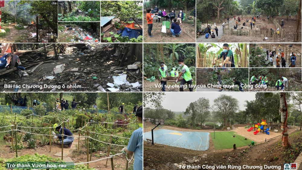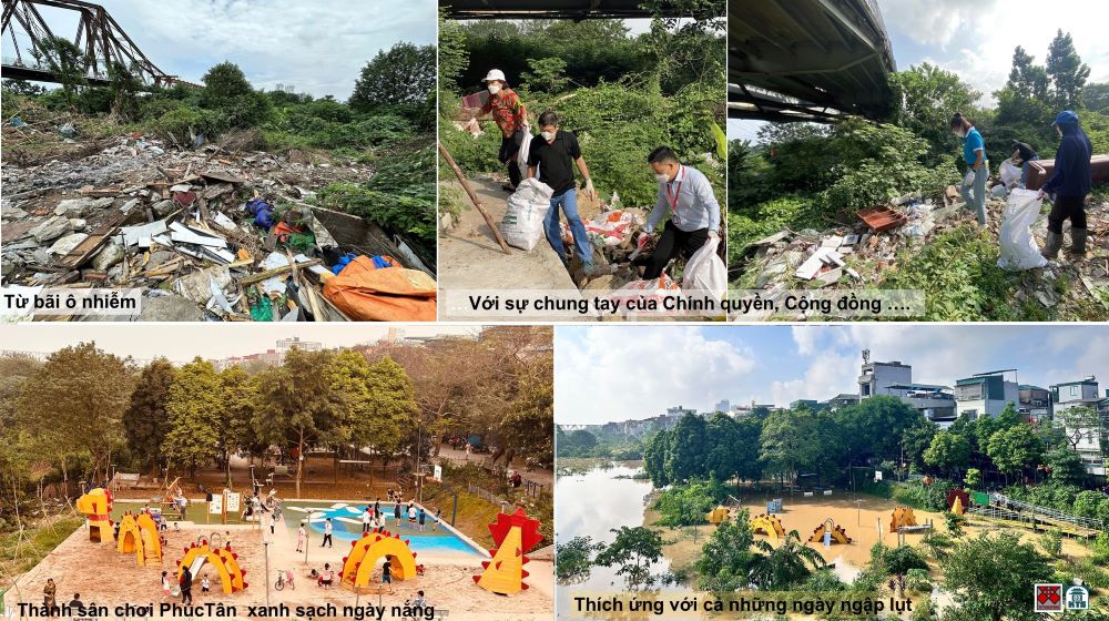 Quá trình dọn rác thải, thu gom xử lý nước thải tại Công viên Rừng Phúc Tân. Việc duy trì, phát triển chọn lọc các giống loài động thực vât tự nhiên đã tạo ra không gian sống mạnh mẽ với chi phí tối ưu, thích ứng, hồi sinh ngay sau ngập lụt, mưa bão.