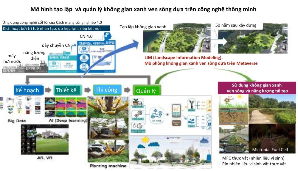 Ứng dụng công nghệ thông minh từ khảo sát thực trạng môi trường sinh thái sông nước đến vận hành, quản lý các công trình gia tăng chất lượng cảnh quan sinh thái, dự báo tiến trình sinh trưởng cho tới 50 năm sau nhờ mô phỏng bằng mô hình thông tin cảnh quan (LIM – Landscape Information Modeling)