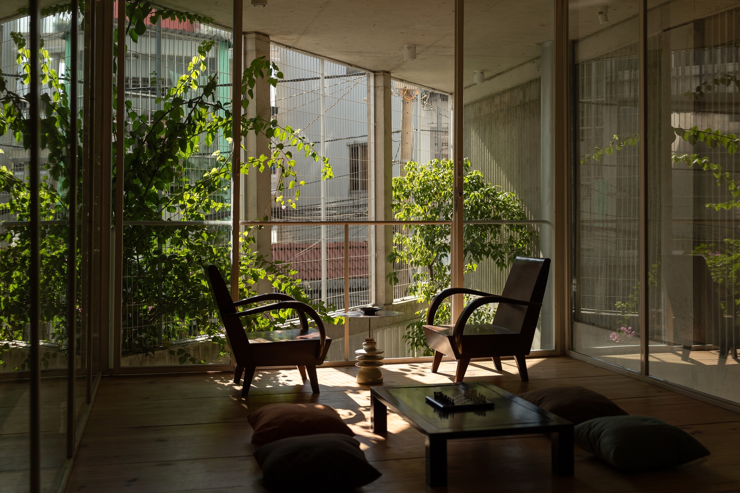 Phía sau nhà, một khu vườn thẳng đứng hướng về phía Tây tạo bóng râm, kết hợp với cầu thang và các tấm chớp phía trên cửa ra vào, tạo điều kiện thông gió tự nhiên từ sau ra trước. Sảnh tầng được thiết kế như một không gian bán công cộng, giúp cải thiện luồng không khí và mở rộng tầm nhìn, đồng thời mở rộng không gian căn hộ cho các hoạt động như tiếp khách, đọc sách hoặc các hoạt động khác trong một khu vườn xen kẽ.