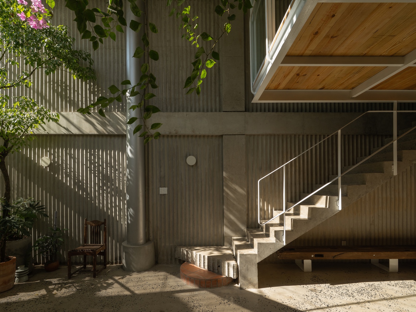 Tầng trệt và tầng lửng được thiết kế thông thoáng với các vách ngăn tối thiểu, tạo sự chuyển tiếp liền mạch từ ngõ vào nhà. Cổng và cửa lưới thép tăng cường sự trong suốt, xóa nhòa ranh giới giữa nhà và ngõ. Khoảng trống đóng vai trò là vùng chuyển tiếp giữa bên trong và bên ngoài, được thiết kế như một không gian chung linh hoạt, trở thành điểm kết nối chính cho cư dân.