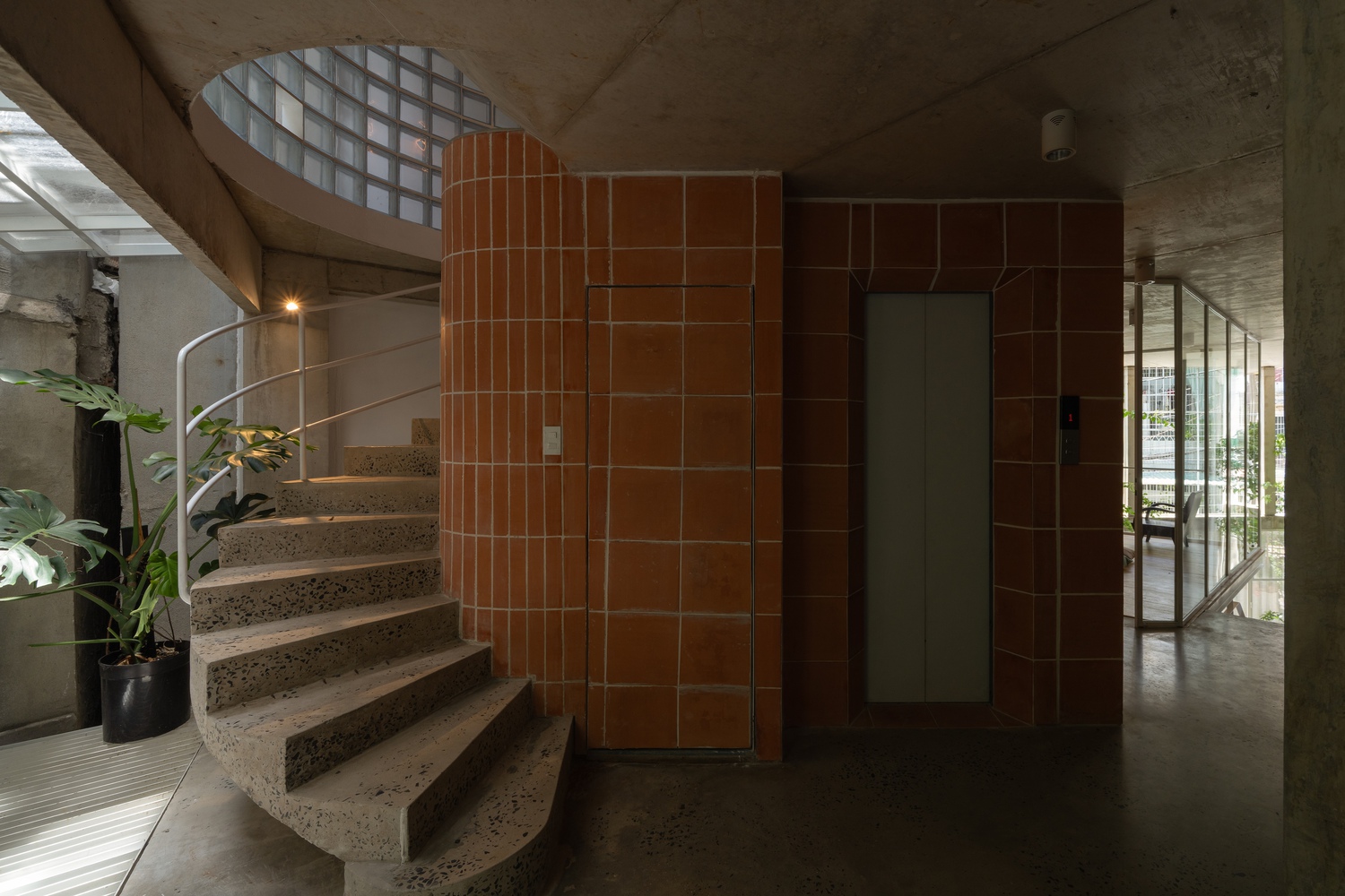 Lõi thang máy được thiết kế như một yếu tố điêu khắc, trông như đang lơ lửng trong khoảng không, đồng thời đóng vai trò là một bộ phận chịu lực kết cấu. Các bức tường kéo dài từ trục thang máy tạo ra các hốc hình tam giác, được sử dụng làm loggia, nhà vệ sinh, góc trồng cây hoặc các khoảng trống thẳng đứng.