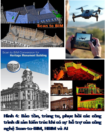 Mô phỏng phục dựng: AI giúp so sánh hiện trạng với các tư liệu lịch sử để gợi ý các phương án phục dựng nguyên gốc. Đối với việc kết hợp truyền thống và hiện đại, hoặc cải tạo xen cấy thêm chức năng mới cho công trình, AI sẽ giúp kiến trúc sư thử nghiệm các giải pháp vật liệu mới (như kính, thép) sao cho hòa quyện với kết cấu gỗ cổ truyền mà không làm mất đi tính nguyên bản (Authenticity) hoặc hài hòa với phong cách kiến trúc của công trình hoặc quần thể công trình…