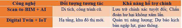 Bảng 2: So sánh sự hỗ trợ của Scan-to-BIM+AI với Digital Twin+IoT trong quản lý, quản trị công trình và hạ tầng kỹ thuật trong các đô thị