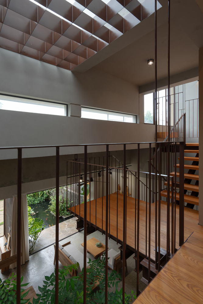 3. Độ tương phản – Mái bằng được chia thành các phần nhỏ hơn theo hướng dốc của các tòa nhà lân cận trong khi vẫn duy trì hình dạng nằm ngang riêng biệt. Thiết kế này vừa phản ứng với bối cảnh vừa tạo ra các khu vườn trên mái cho các hoạt động ngoài trời của gia đình. Sự kết hợp giữa vật liệu thô và lớp hoàn thiện tinh tế – như các bậc đá tự nhiên kết hợp với gỗ và đá mài – cùng với việc sử dụng ánh sáng tự nhiên một cách chiến lược, tạo ra sự tương phản mạnh mẽ về kết cấu và độ sáng. Những sự tương phản này làm phong phú thêm trải nghiệm không gian cho người dùng.