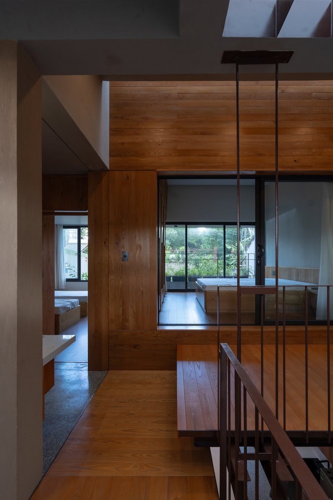 2. Không gian chuyển tiếp: Bên trong / Giữa / Bên ngoài – Ngôi nhà áp dụng cả chiến lược thiết kế “bên trong ra ngoài” và “bên ngoài vào trong” để kết nối không gian bên trong và bên ngoài thông qua nhiều lớp kiến ​​trúc và cảnh quan. Cách tiếp cận này tạo thêm chiều sâu không gian và làm mềm ranh giới giữa các khu vực trong nhà và ngoài trời, tạo ra trải nghiệm tương tự như một cuộc đi bộ chậm rãi, liên tục. Việc sử dụng vật liệu cảnh quan trong không gian nội thất cũng giúp hòa hợp tòa nhà với thiên nhiên.