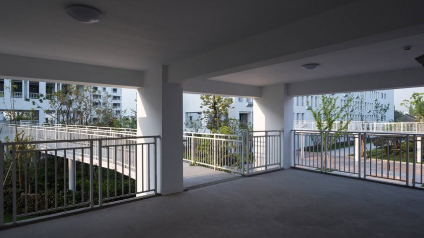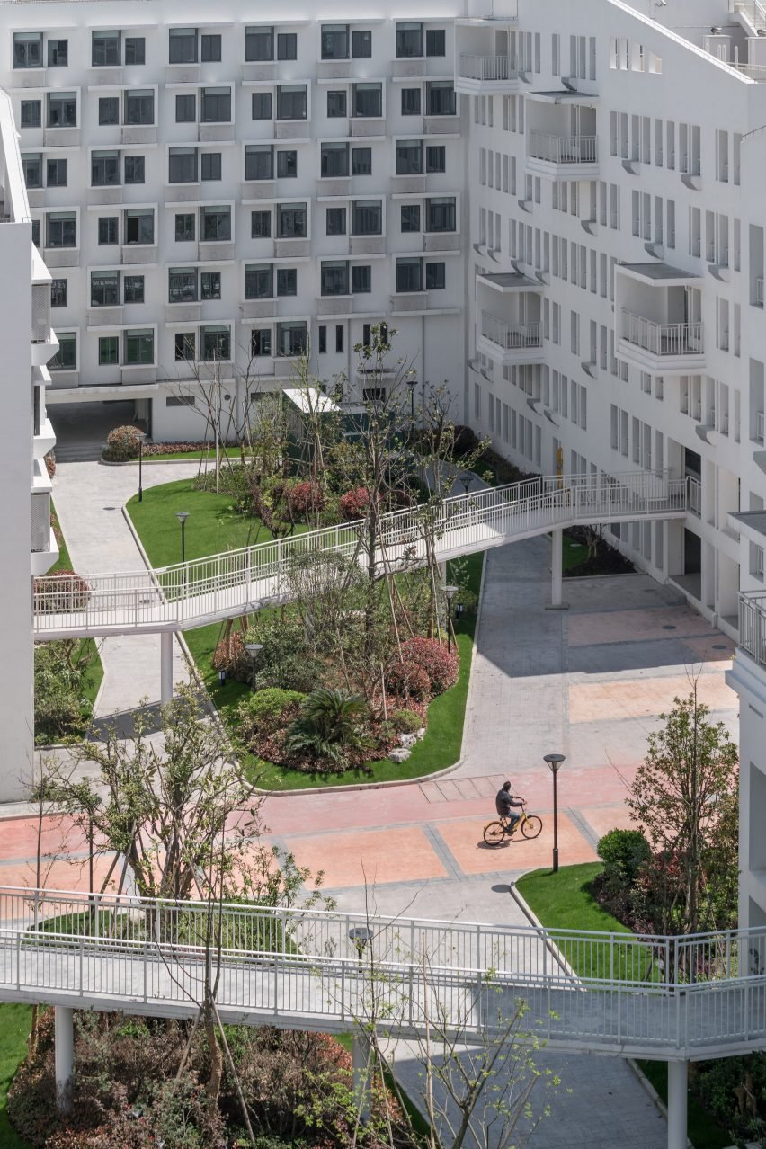 Các hành lang và cầu mở kết nối bốn tòa nhà trong sân ở nhiều tầng khác nhau, gợi nhớ đến hình thức kiến trúc có nguồn gốc sâu xa từ thiết kế sân vườn truyền thống của Trung Quốc, cung cấp nhiều không gian công cộng hơn cho cư dân ngoài tầng trệt.