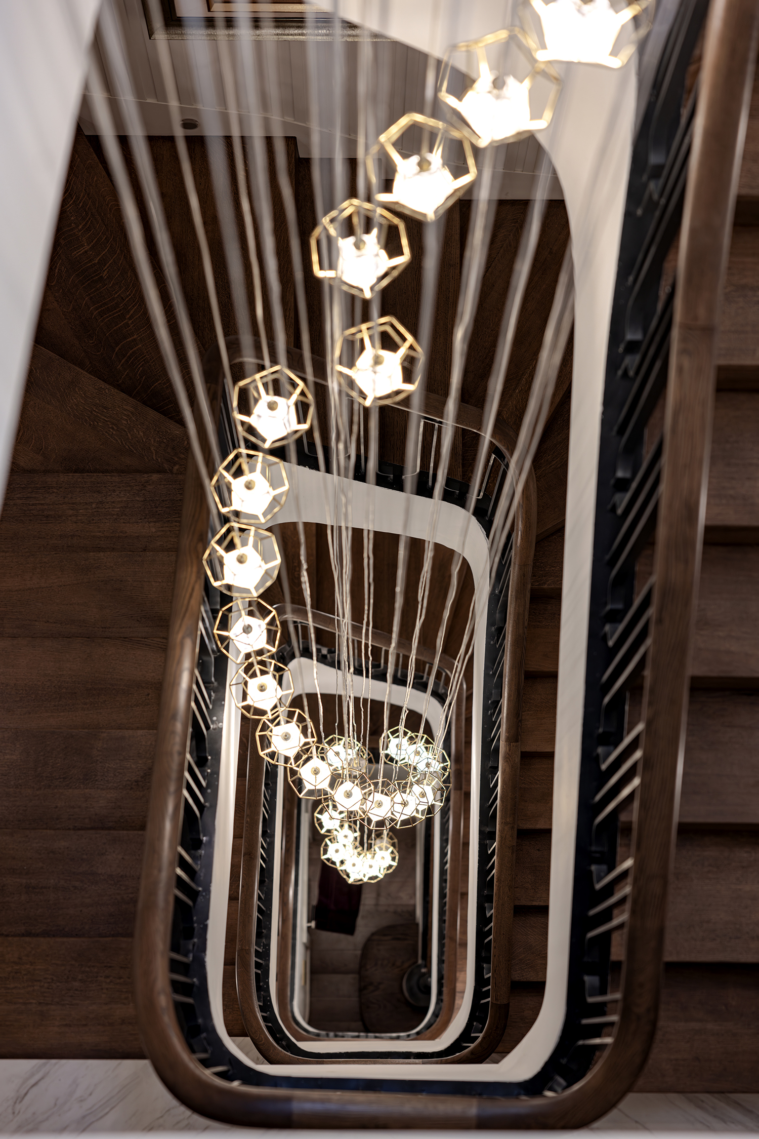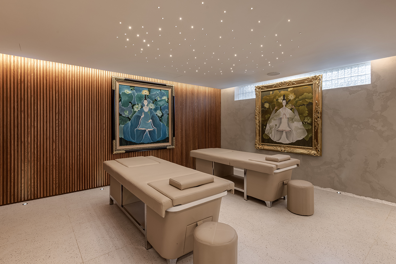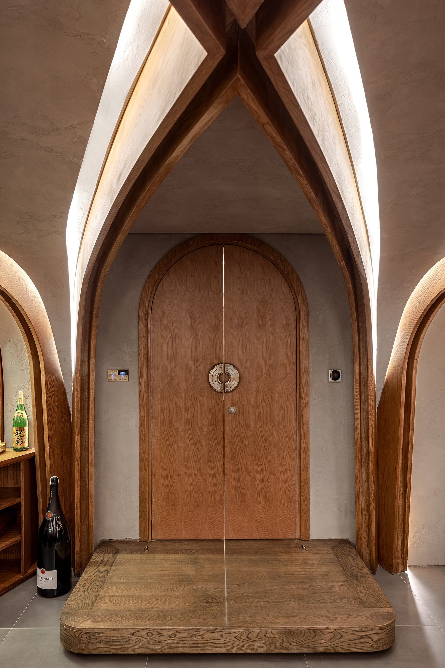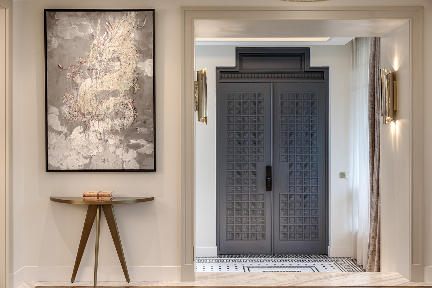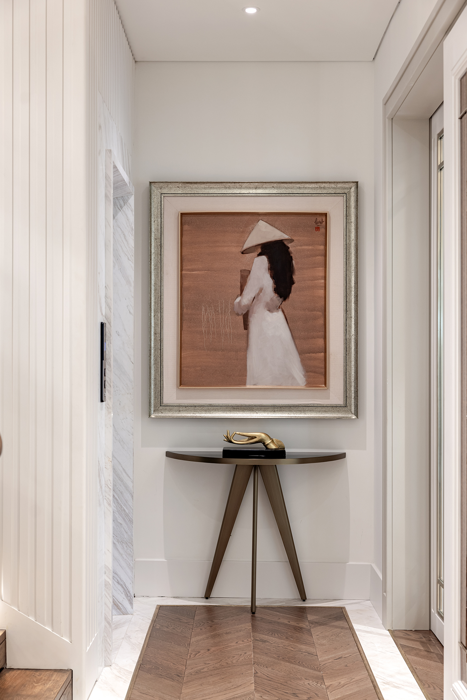 Biểu tượng này không được sử dụng một cách khiên cưỡng mà xuất hiện như những “điểm chạm” đầy chủ ý tại các không gian chuyển tiếp. Ngay từ ngưỡng cửa đầu tiên, logo xuất hiện với tỷ lệ lớn, cách điệu thành hệ hoa thép tinh xảo trên cổng chính, định danh cho công trình ngay từ mặt lộ. Tiến vào bên trong, sự hiện diện ấy trở nên ý nhị hơn khi được chuyển hóa thành họa tiết chạm khắc trên cửa chính, và kết thúc hành trình tại sảnh đón bằng một bức tranh mosaic ghép tay thủ công tỉ mỉ dưới sàn. Sự xuất hiện có nhịp độ này tạo nên một cảm giác thuộc về đầy tự hào, biến ngôi nhà thành một thực thể duy nhất, không thể trộn lẫn.