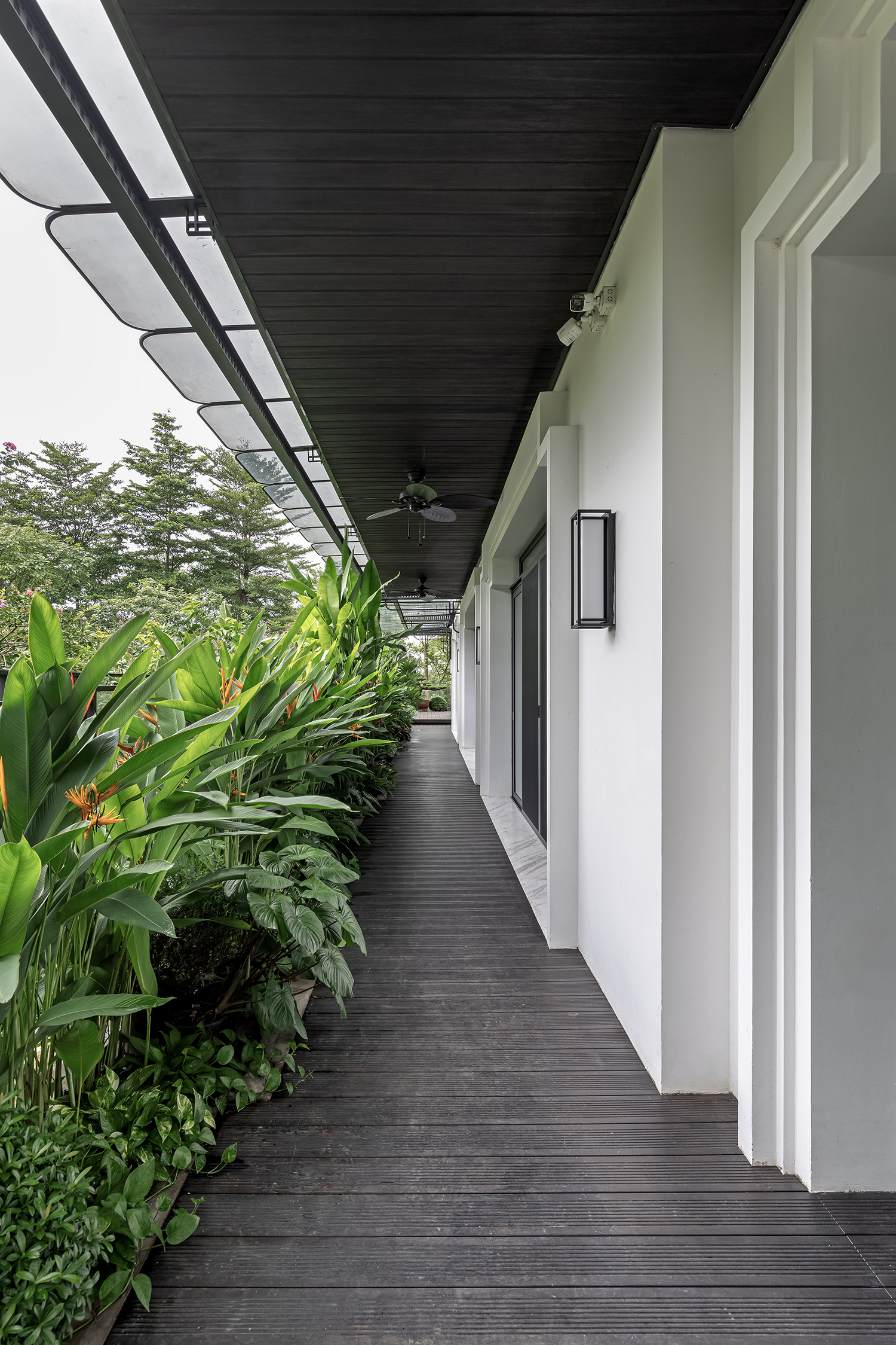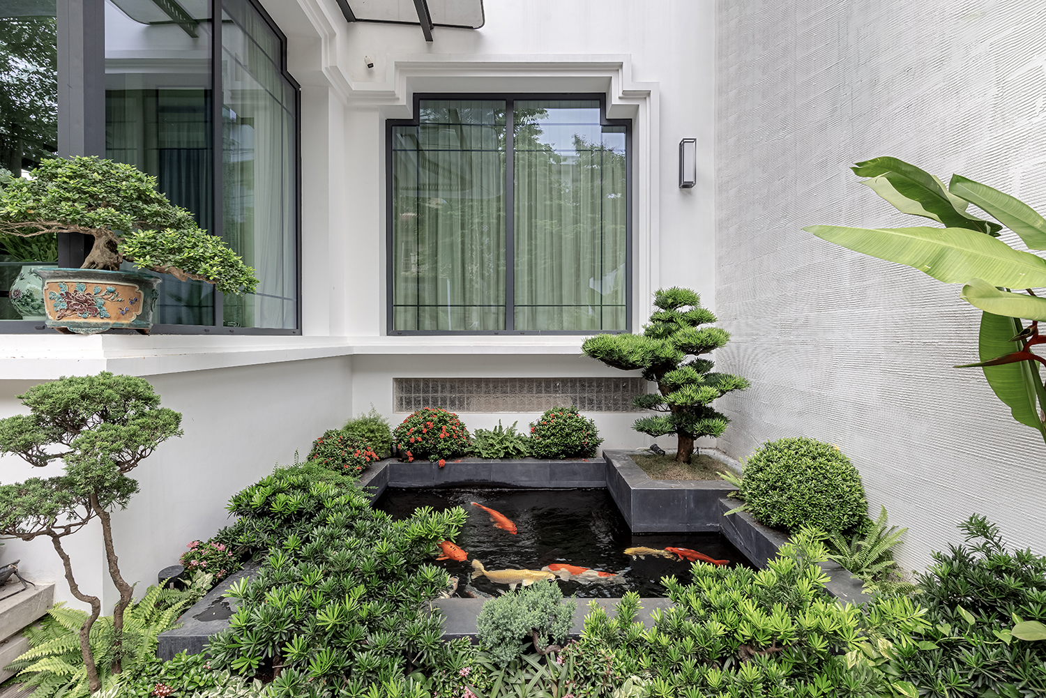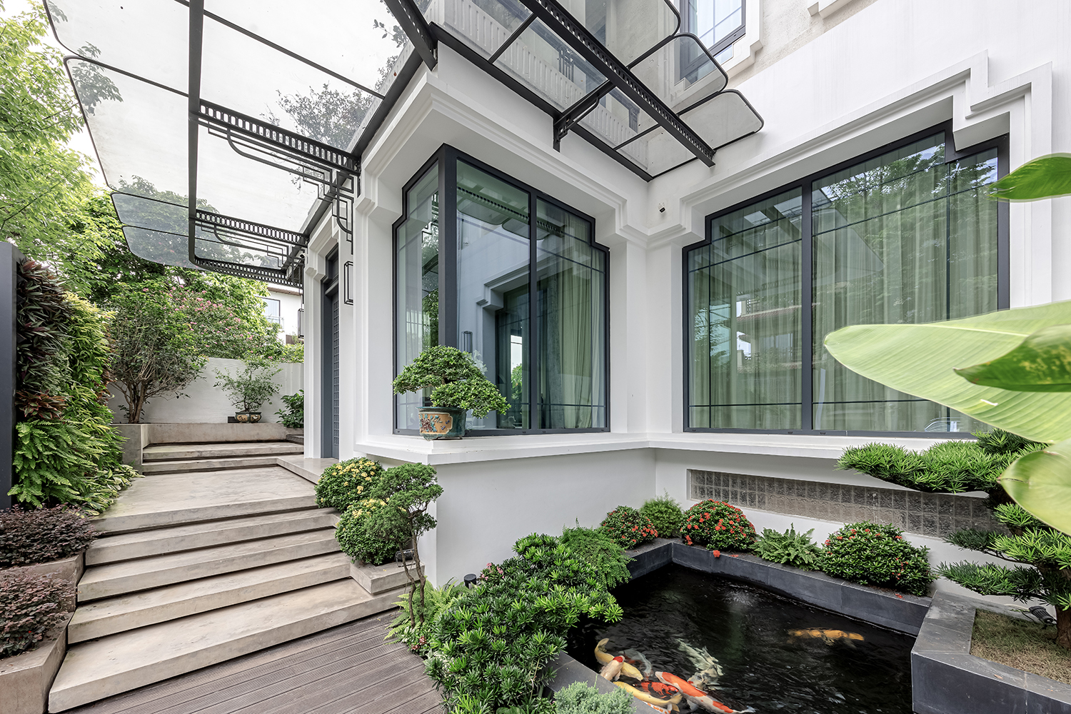 Tại L Villa, sự sang trọng không nằm ở những chi tiết trang trí cầu kỳ mà hiện diện trong sự thấu hiểu về tỷ lệ và cảm xúc không gian. Ngay tại lối vào, một hồ cá Koi chạy dọc mặt tiền đóng vai trò như một “lớp đệm” thanh lọc bụi bẩn và tiếng ồn, tạo ra một khoảng lặng thư thái trước khi bước vào không gian sống.