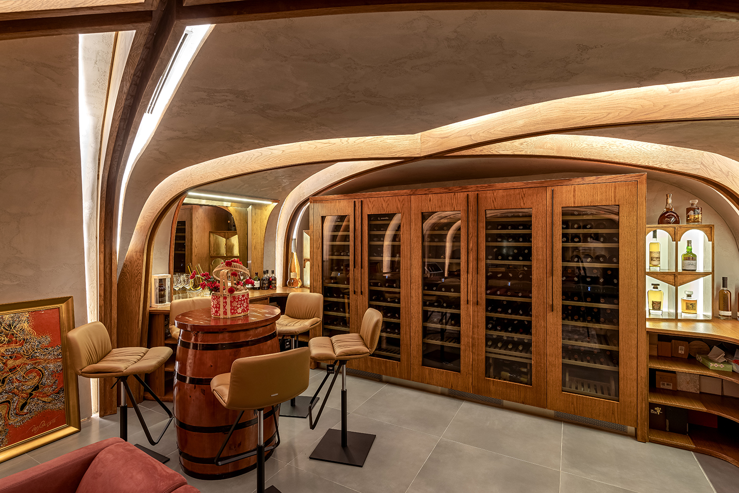 Cấu trúc tầng trệt được tổ chức theo lối phân lớp không gian, tạo ra những khoảng mở thị giác nhưng vẫn đảm bảo sự riêng tư và ấm cúng cần thiết cho sinh hoạt gia đình. Nếu như tầng hầm được định vị như một “vùng trũng” của sự tĩnh lặng – nơi ánh sáng vàng ấm áp và vật liệu gỗ trầm mặc vỗ về những phút giây giải trí và trị liệu tại gia; thì tầng thượng lại là sự mở lòng với thiên nhiên. Tại đây, khu vực gym, xông hơi và vườn xanh trên mái không chỉ là tiện ích, mà là giải pháp cải thiện vi khí hậu, đưa hơi thở của trời mây vào sâu trong lòng công trình.