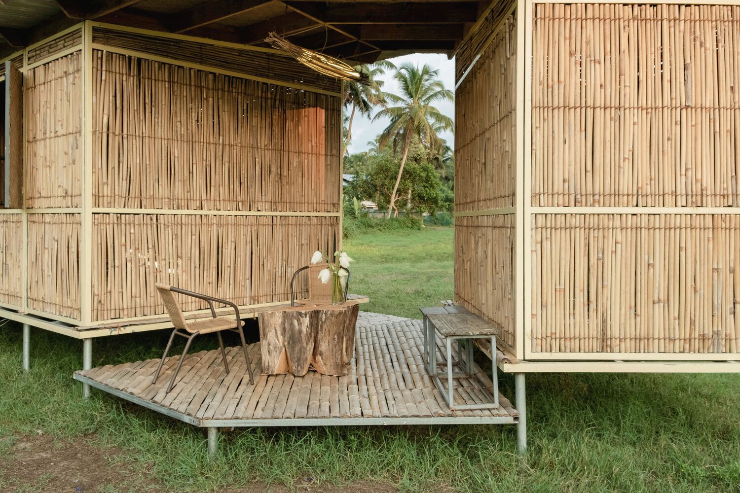 Hơn nữa, không gian sống và phòng ngủ được phân chia bằng các tấm ván phức tạp làm từ tre và cỏ, dùng cho tường, cửa ra vào, sàn nhà và cửa sổ. Các kiến trúc sư của NO tin rằng hệ thống này sẽ thu hẹp khoảng cách giữa sản xuất nhà ở module và bối cảnh địa phương. Nó tạo ra các hệ thống vật liệu dễ liên hệ, có thể được cộng đồng địa phương sửa chữa hoặc cải tạo. Biểu hiện kiến trúc của công trình thí điểm này sẽ khác nhau tùy thuộc vào vị trí địa lý và kỹ thuật thủ công địa phương. Tuy nhiên, hệ thống kết cấu của nó có thể được triển khai lại ở một địa điểm khác, với chi phí và thời gian tối thiểu.