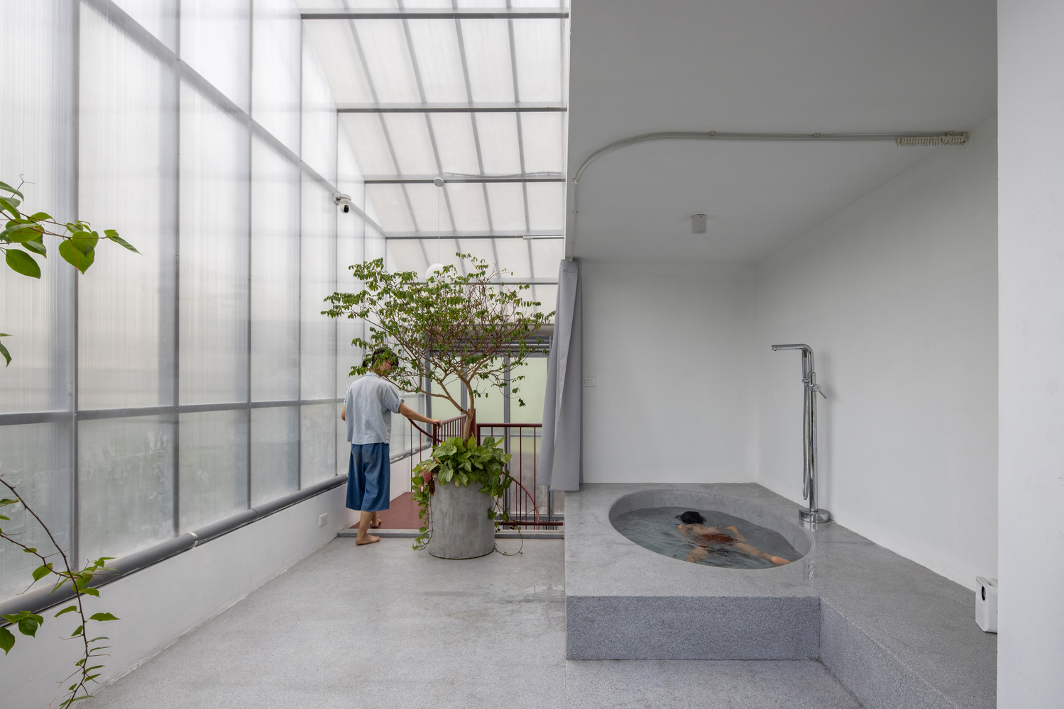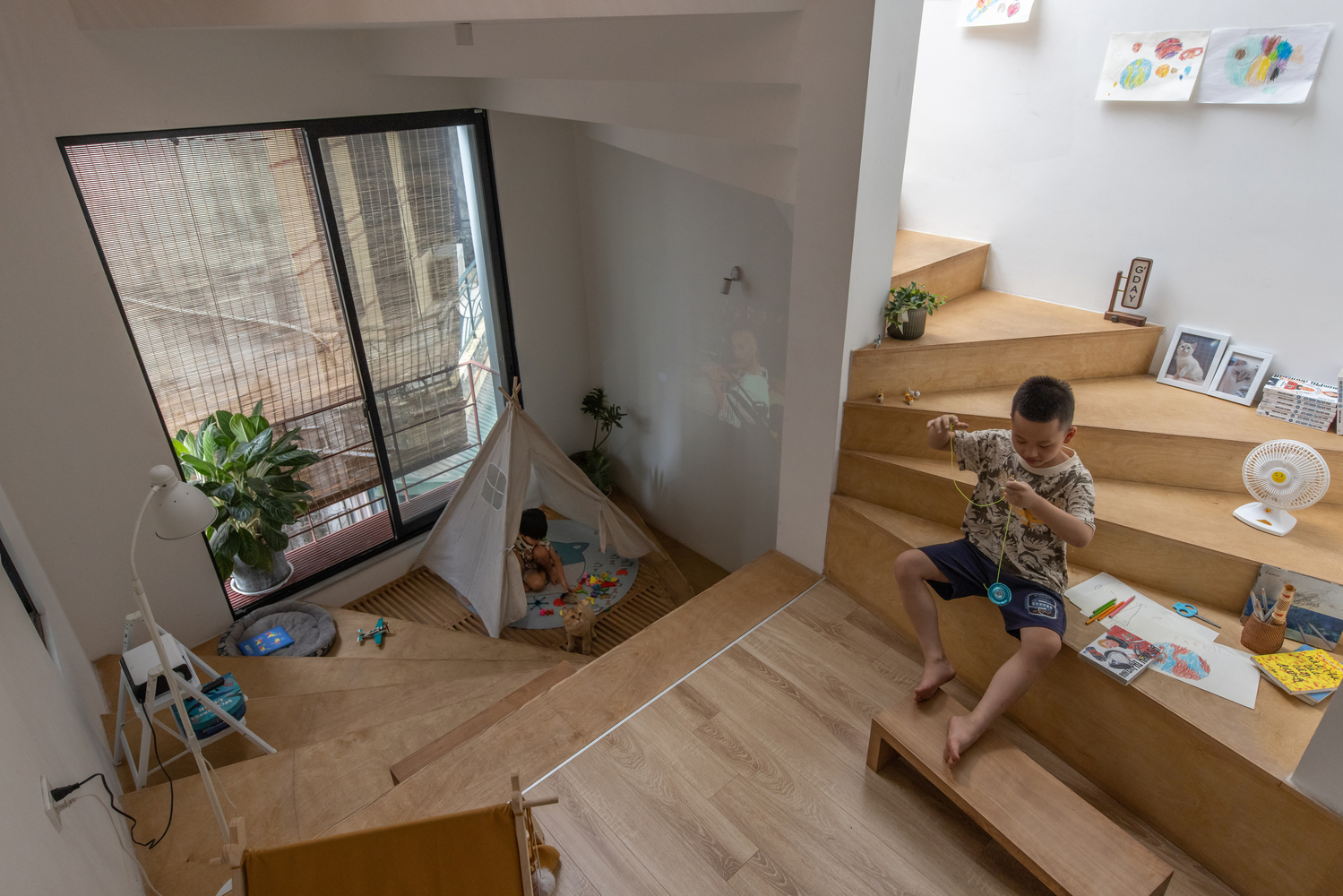 Giếng trời và sàn gỗ có lam chắn giúp thông gió và điều hướng ánh sáng. Lối vào ở tầng trệt được lùi vào trong để tạo thêm không gian cho “Ngõ” và kết nối với các nhà hàng xóm.