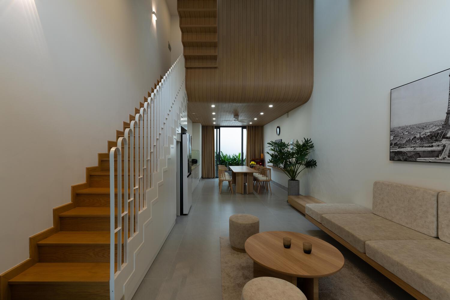 Điểm nhấn đặc biệt của dự án là trần nhà bằng gỗ nhân tạo uốn cong, trải dài liên tục từ không gian nội thất ra ban công ngoài trời. Mặt tiền phía trước được trang trí bằng cây xanh nhiều lớp ở cổng vào, ban công và sân thượng, trong khi mặt tiền phía sau cũng có cây xanh trồng bên ngoài cửa sổ. Những lớp cây xanh này giúp lọc ánh nắng trực tiếp và duy trì môi trường bên trong mát mẻ hơn.