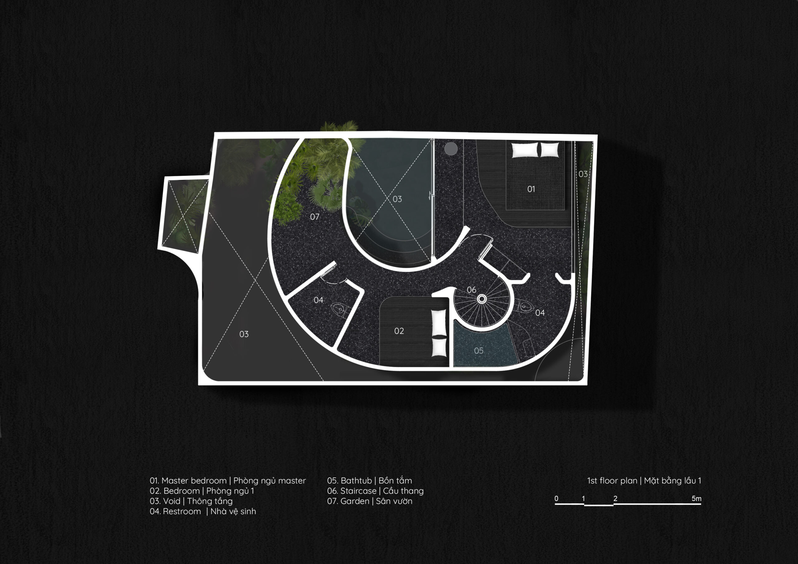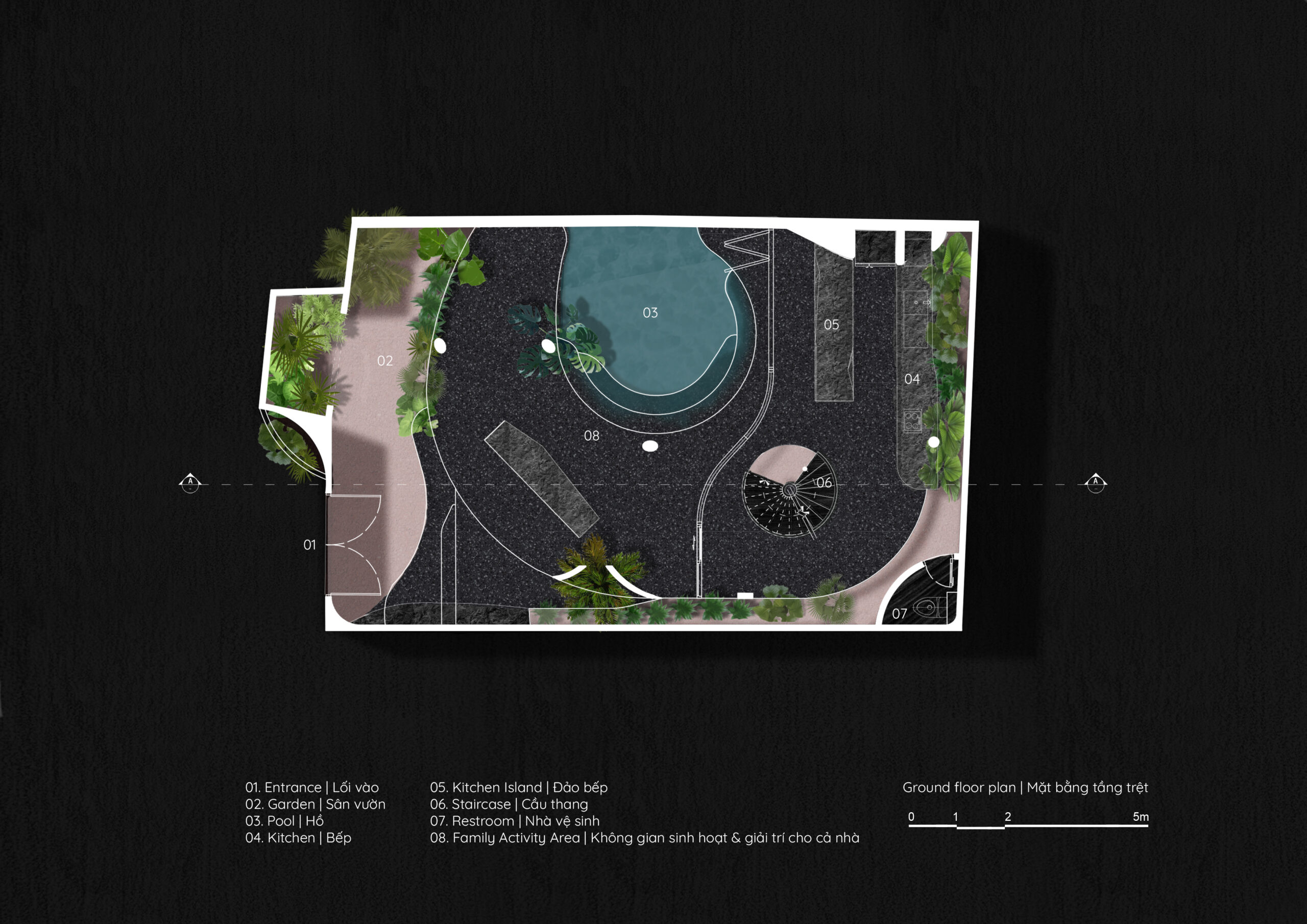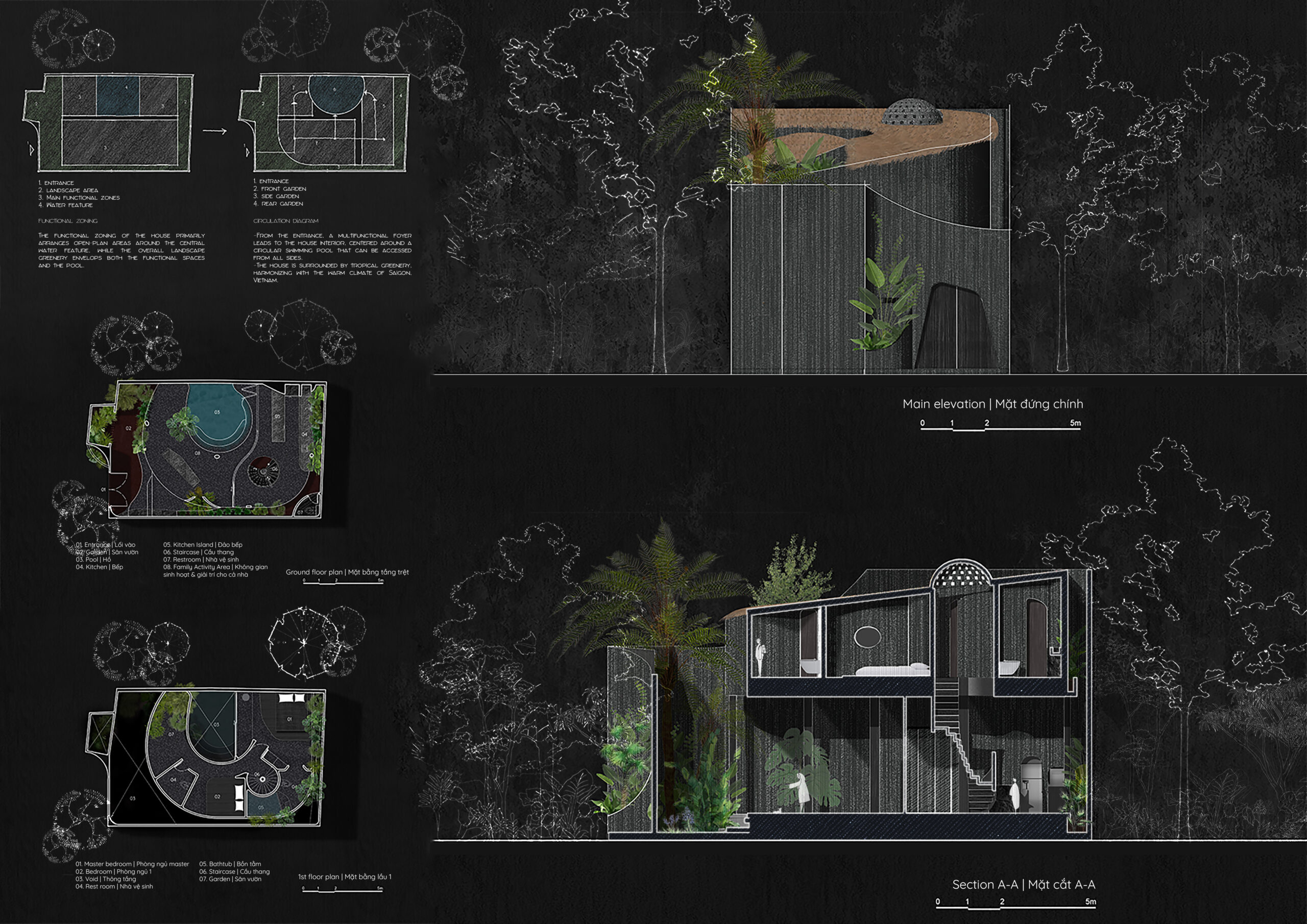 Giải pháp không gian & tổ chức mặt bằng – Tầng trệt được tổ chức theo nguyên tắc tối thiểu hóa không gian chức năng để tối đa hóa diện tích sân vườn và mặt nước, chiếm khoảng 70% diện tích sàn. Cách tiếp cận này cho phép thiên nhiên len lỏi sâu vào từng khu vực sinh hoạt, tạo sự kết nối liên tục giữa trong và ngoài.