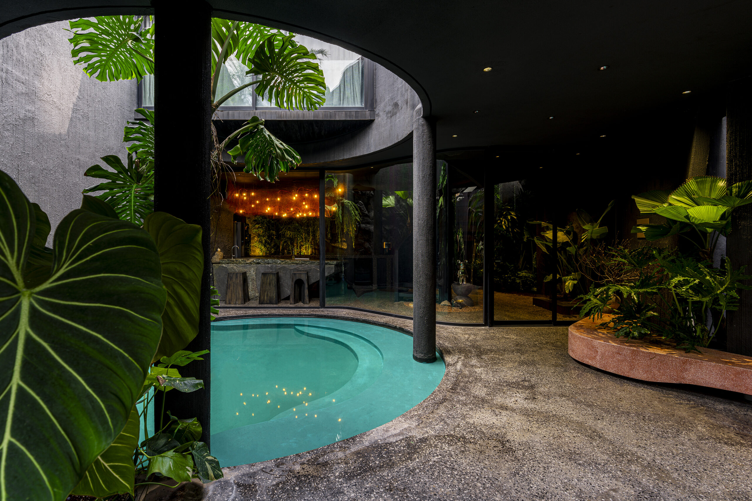 Hình khối công trình được phát triển theo bố cục xoay quanh sân trong, hình thành dòng chảy không gian liền mạch và đa dạng góc nhìn khi di chuyển.