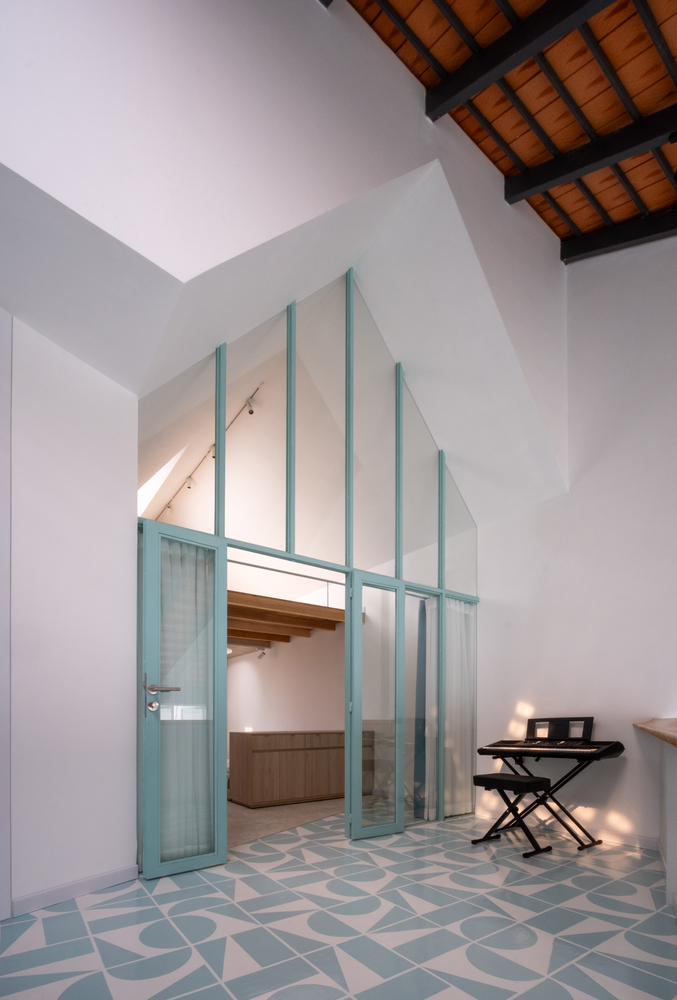 Hình ảnh mái nhà nông thôn, nơi lưu giữ những kỷ niệm về bà và mẹ, là nguồn cảm hứng chính cho hình dạng của dự án. Ngôn ngữ thiết kế nghiêng được áp dụng nhất quán để gợi lên hình bóng quen thuộc của những mái nhà truyền thống và làm dịu đi lớp cứng nhắc thường thấy ở nhà phố. Các đường mái đan xen bao quanh sân chung nhẹ nhàng gợi lên tiềm thức, mang đến cảm giác quen thuộc cho những người đã rời xa quê hương – và, giống như một sợi dây vô hình của tình thân, truyền sự ấm áp và kết nối qua nhiều thế hệ.