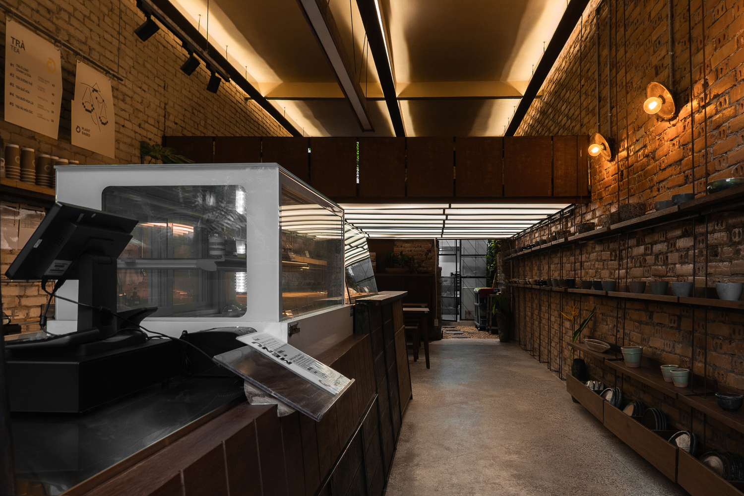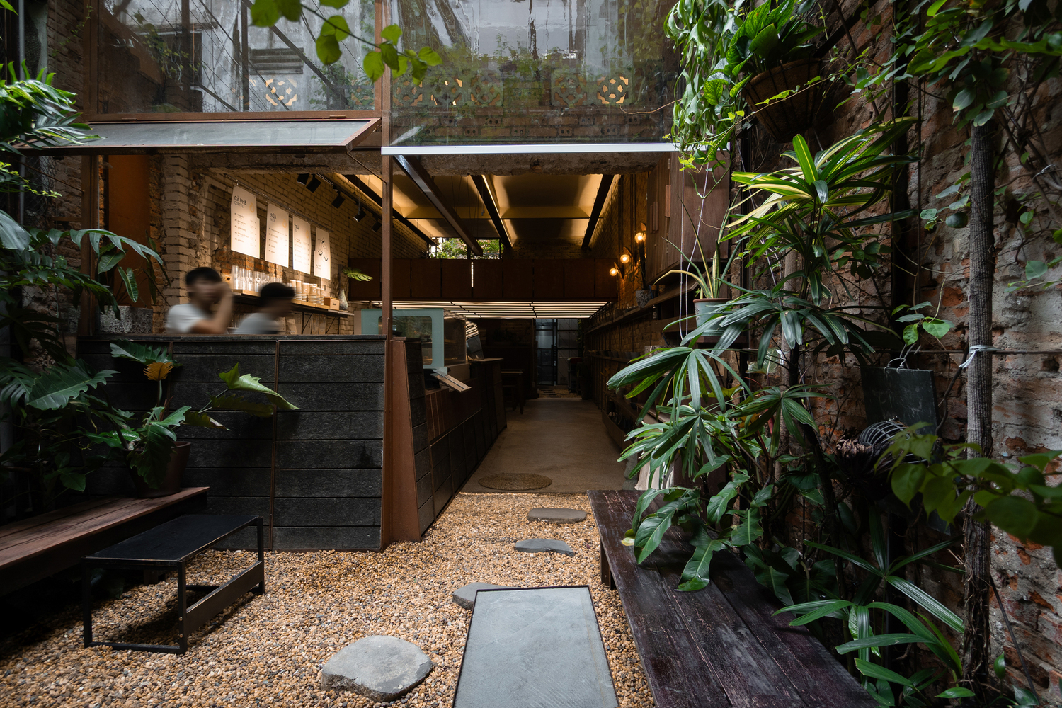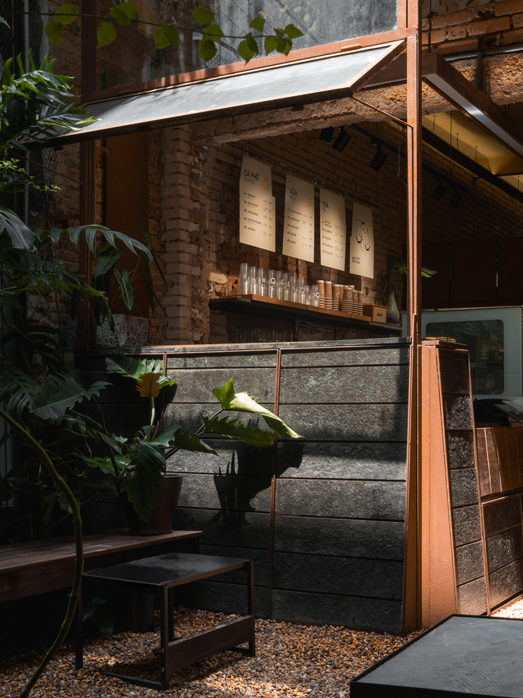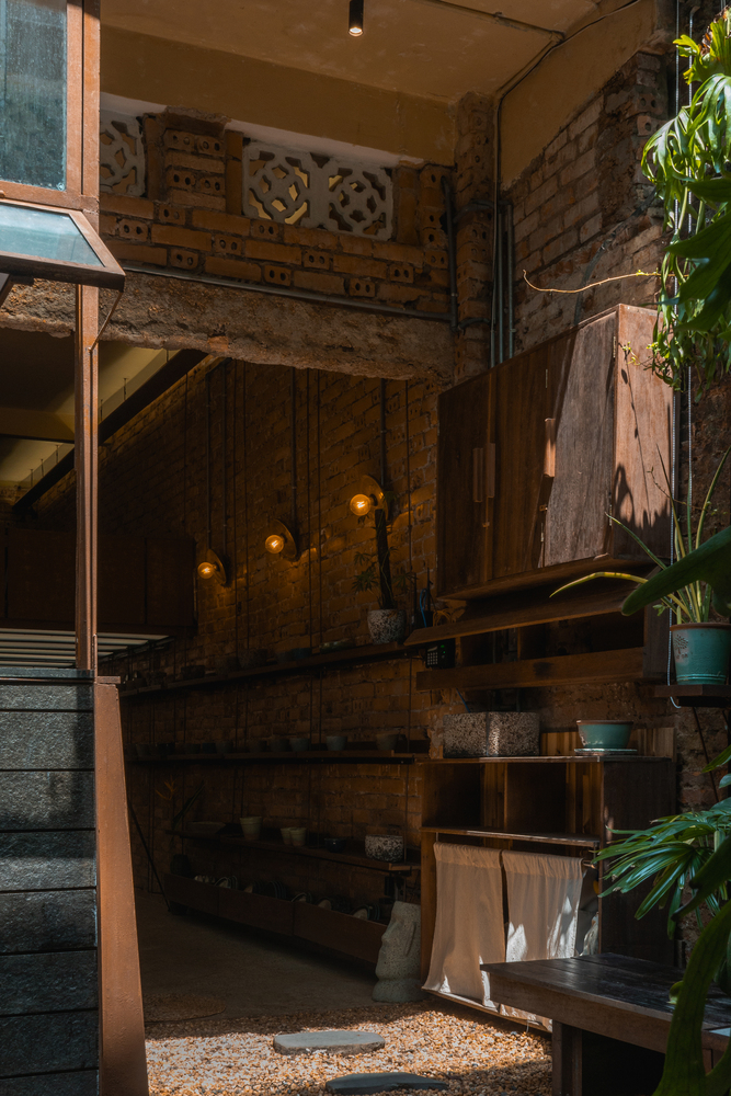 Ở tầng trệt, kết cấu dầm gỗ nguyên bản – đặc trưng của nhà ở truyền thống chịu ảnh hưởng của Trung Quốc – được giữ lại và tái sử dụng làm khu vực ăn uống với trần nhà thấp đáng kể. Cách sắp xếp không gian này tạo cảm giác gần gũi, gợi lên cảm giác về những bữa ăn cộng đồng truyền thống: bàn thấp, đồ ăn chung và cảm giác gắn kết.