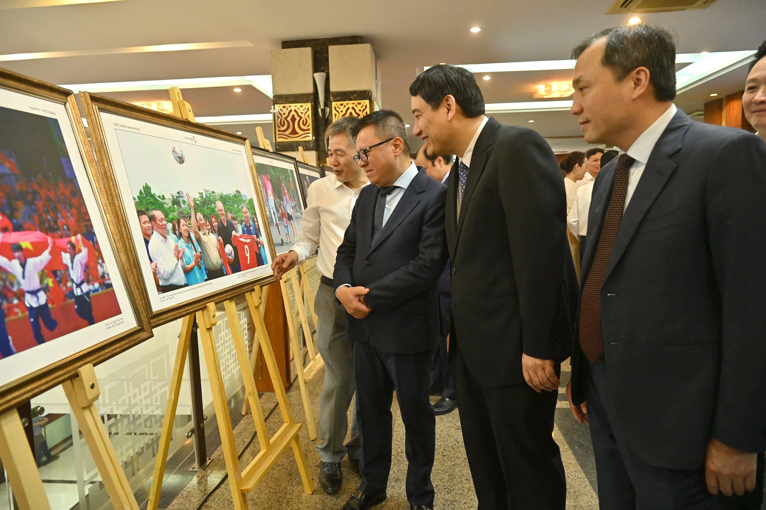 Các đồng chí Ủy viên Trung ương Đảng: Tổng Biên tập Báo Nhân Dân, Chủ tịch Hội Nhà báo Việt Nam Lê Quốc Minh; Chủ nhiệm Ủy ban Văn hóa và Xã hội Nguyễn Đắc Vinh; Tổng Biên tập Tạp chí Cộng sản Hoàng Trung Dũng cùng các đại biểu tham quan triển lãm tại Diễn đàn vai trò của báo chí trong việc thúc đẩy phát triển các ngành công nghiệp văn hóa_Nguồn: daibieunhandan.vn