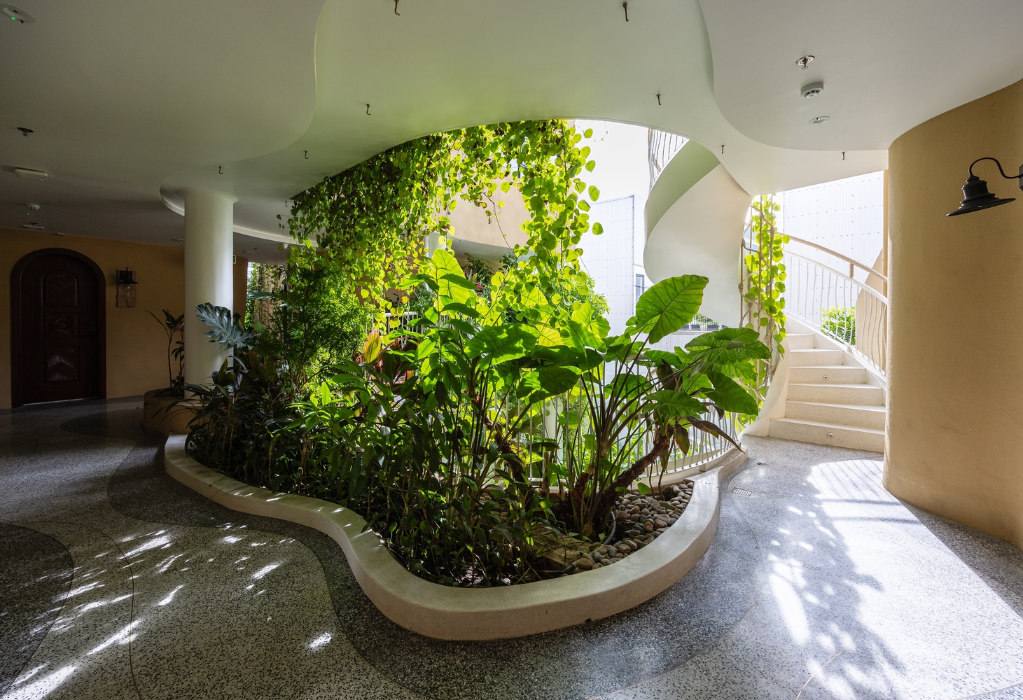 Không gian kiến ​​trúc & đặc điểm – Tầng trệt là một giếng trời thoáng đãng, toát lên vẻ thanh lịch tinh tế. Tại đây, một hồ cá xinh đẹp nổi bật giữa những cây xanh trang trí. Phần lõi trung tâm mở đón ánh sáng tự nhiên từ trên cao, tất cả hòa quyện tạo nên một nguồn sống dồi dào. Quả thực, không gian linh thiêng này chính là trái tim của Saha Casa, nơi mỗi hành lang, như một cánh tay dịu dàng, bao bọc và dẫn dắt du khách đến với sự an toàn của căn phòng. Những tấm thảm xanh ngọc lục bảo vươn lên với vẻ đẹp tinh tế, một bản giao hưởng của thảm thực vật trải dài từ tầng này sang tầng khác, hòa quyện tạo nên một khu vườn thẳng đứng tuyệt đẹp. Những sắc màu bao trùm và những đường cong đầy đam mê hòa quyện rồi lại hiện ra khi dạo bước quanh tòa nhà được trân trọng này.