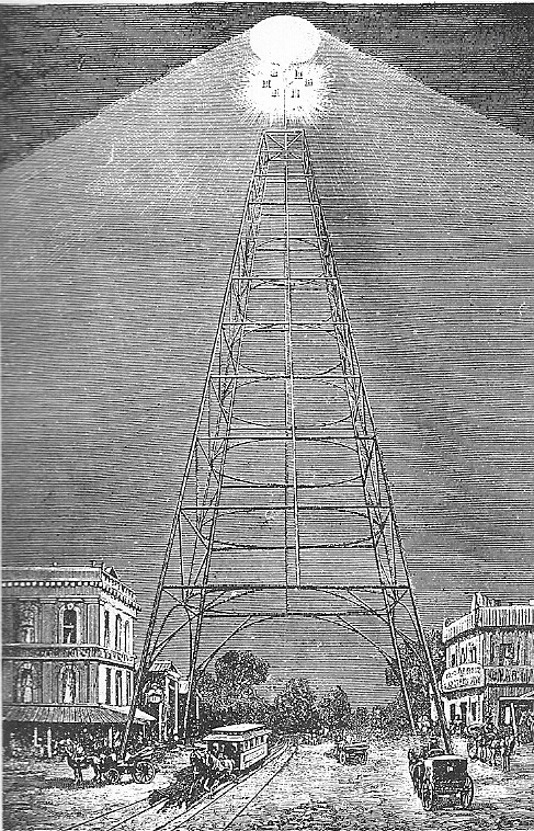Nhiều thị trấn ở Mỹ, đặc biệt là vùng Trung Tây, đã lắp đặt các tháp hoặc cột đèn cao từ 50 đến 150m, từ đó những ánh đèn hồ quang mạnh mẽ chiếu sáng toàn bộ thị trấn. Ngay sau đó, Detroit trở thành thành phố lớn duy nhất trên thế giới được chiếu sáng hoàn toàn bằng hệ thống tháp đèn. Được lắp đặt cách nhau 350 đến 400m ở trung tâm thành phố, hoặc 1000m ở ngoại vi, những tháp đèn này tạo ra những vành đai ánh sáng bao phủ toàn bộ các khu vực, một “Xứ sở thần tiên của sự bình đẳng”. Chưa đầy ba mươi năm sau khi lắp đặt, hệ thống chiếu sáng tháp đèn của Detroit đã được thay thế bằng “đèn đường” thông thường, như một nhà bình luận mô tả là “ngoạn mục hơn là hiệu quả”.
