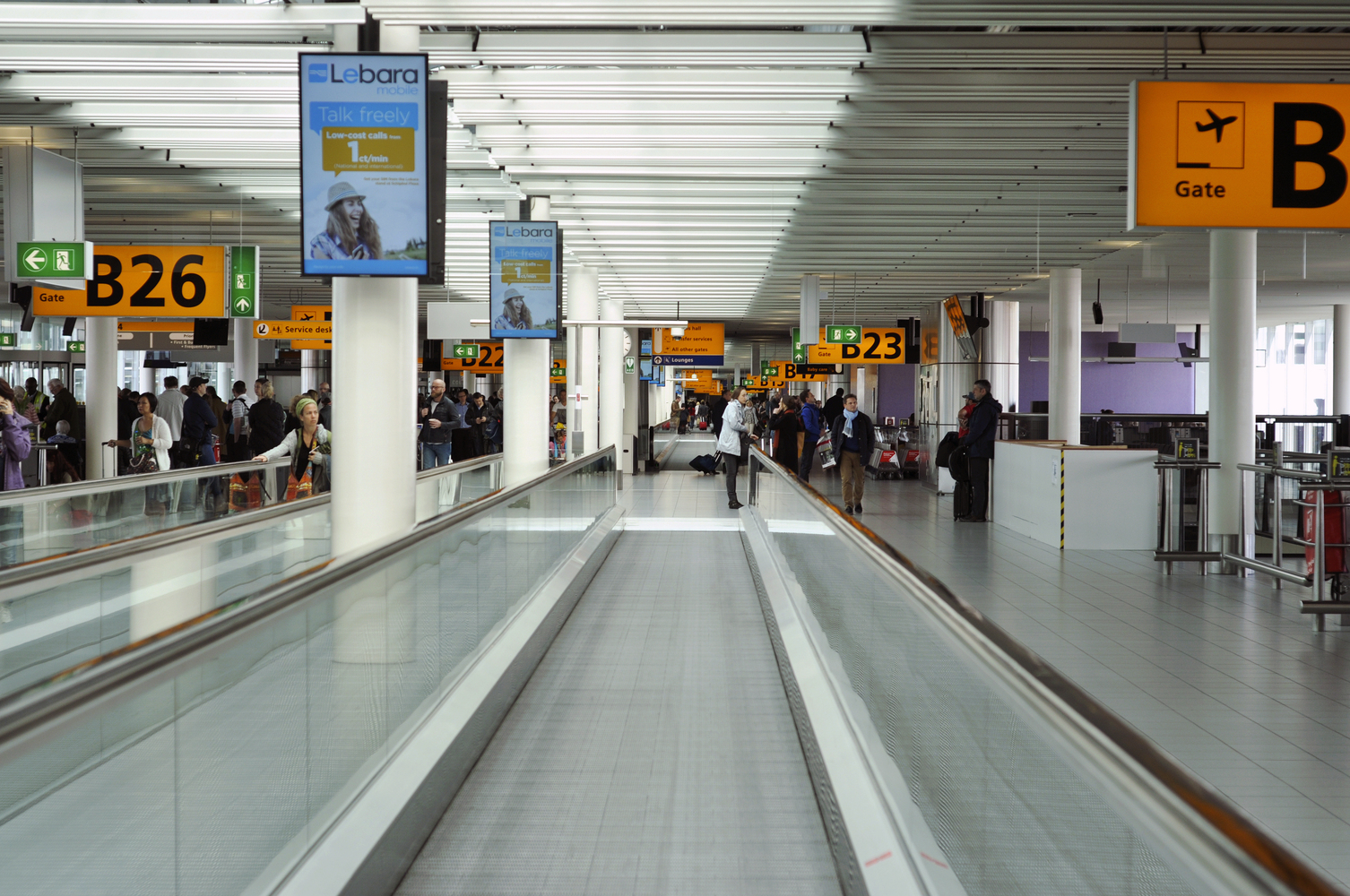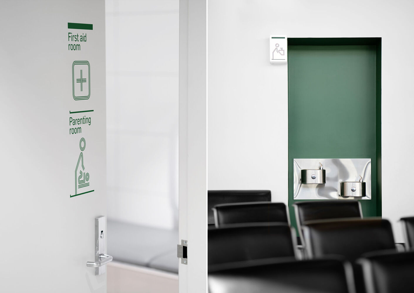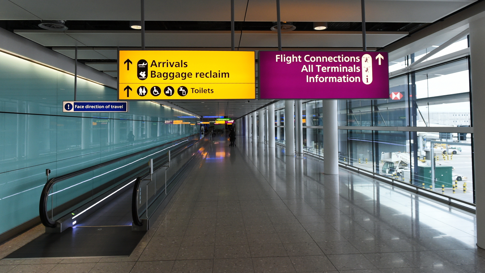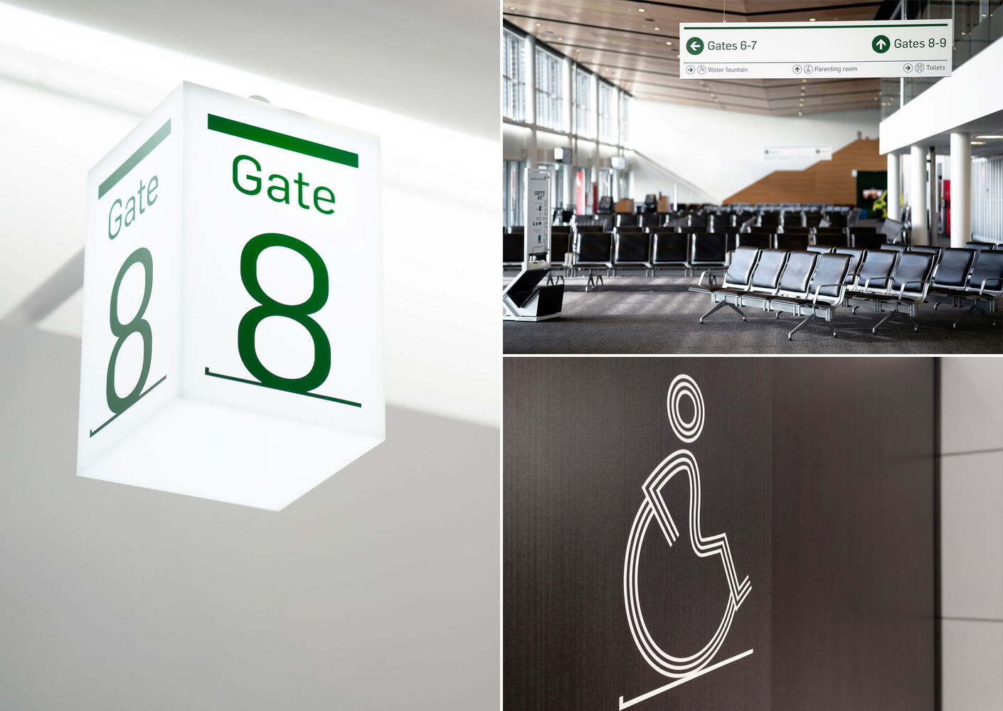 Ngoài ra, khi thiết kế những tòa nhà như vậy, việc lựa chọn màu sắc biển báo phụ thuộc vào môi trường trực quan xung quanh, bao gồm màu nền của tường và cửa sổ, lượng ánh sáng ban ngày trong không gian, ánh sáng và các yếu tố không gian khác. Trong những không gian chật hẹp về mặt thị giác như sân bay, sức mạnh của độ tương phản được sử dụng để tăng cường khả năng đọc biển báo. Điều này bao gồm từ độ tương phản màu sắc riêng biệt giữa chữ cái và nền biển báo cho đến sự khác biệt giữa biển báo và môi trường trực quan xung quanh.