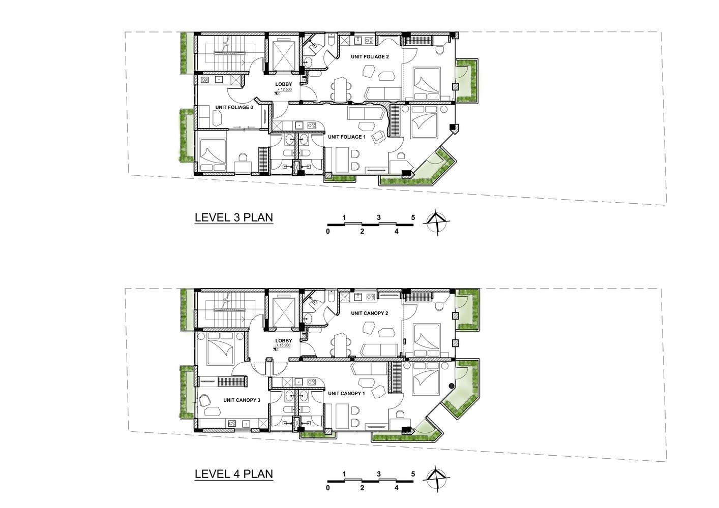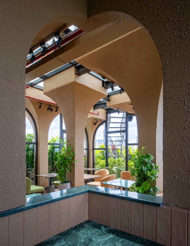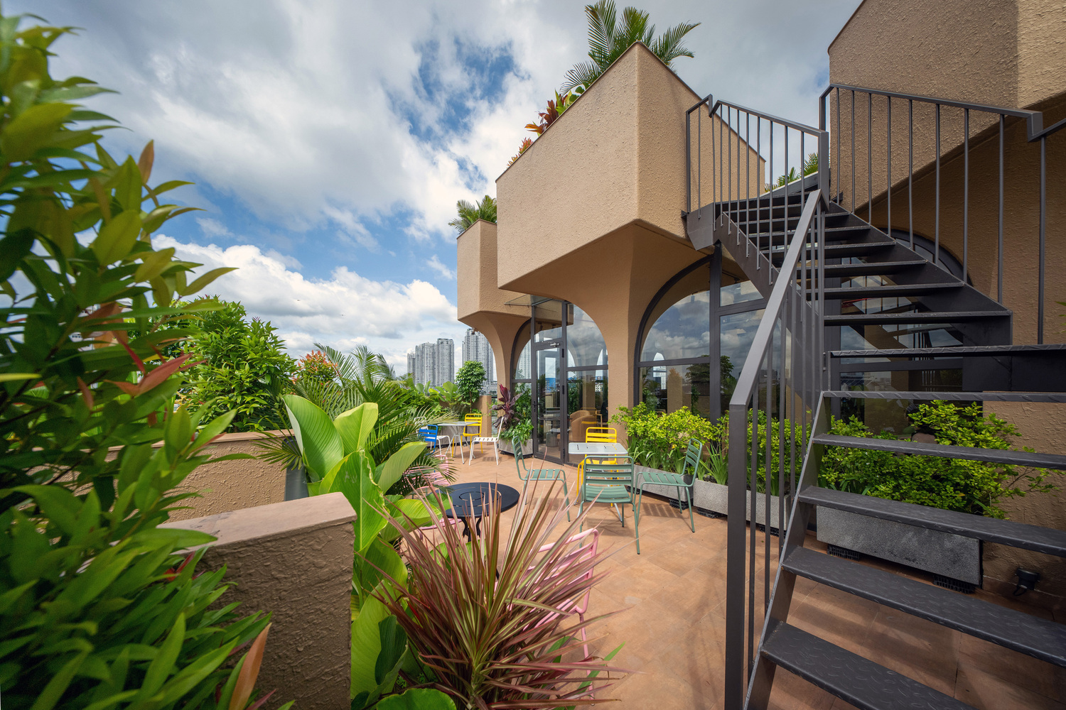 Bên trong, ngôn ngữ hữu cơ vẫn tiếp tục. Nội thất thương mại và chín căn hộ ấm cúng mang những đường cong mềm mại, hình khối bất đối xứng và lớp hoàn thiện bằng đất sét ấm áp, mang đến cảm giác gần gũi và uyển chuyển. Mỗi căn hộ đều mở ra một hoặc hai ban công xanh mướt cây cối, xóa nhòa ranh giới giữa nội thất và thiên nhiên. Trên đỉnh tòa nhà, một quán cà phê trên tầng thượng và không gian làm việc chung ẩn mình dưới tán cây thanh mảnh và mái nhà trong suốt rực rỡ. Cầu thang zíc zắc dẫn lên khu vườn trên tầng thượng – một chốn ẩn náu hiếm có trong đô thị với tầm nhìn bao quát toàn cảnh thành phố. Cùng nhau, những không gian này khơi gợi cảm giác khám phá, như thể đang lang thang dưới tán cây và vươn lên tận ngọn cây giữa một khu rừng đô thị bí ẩn.