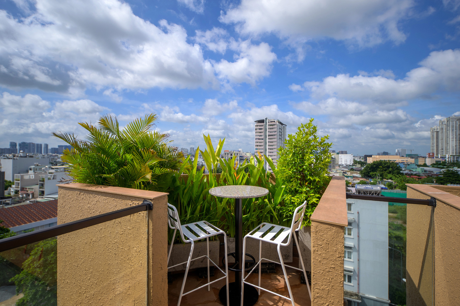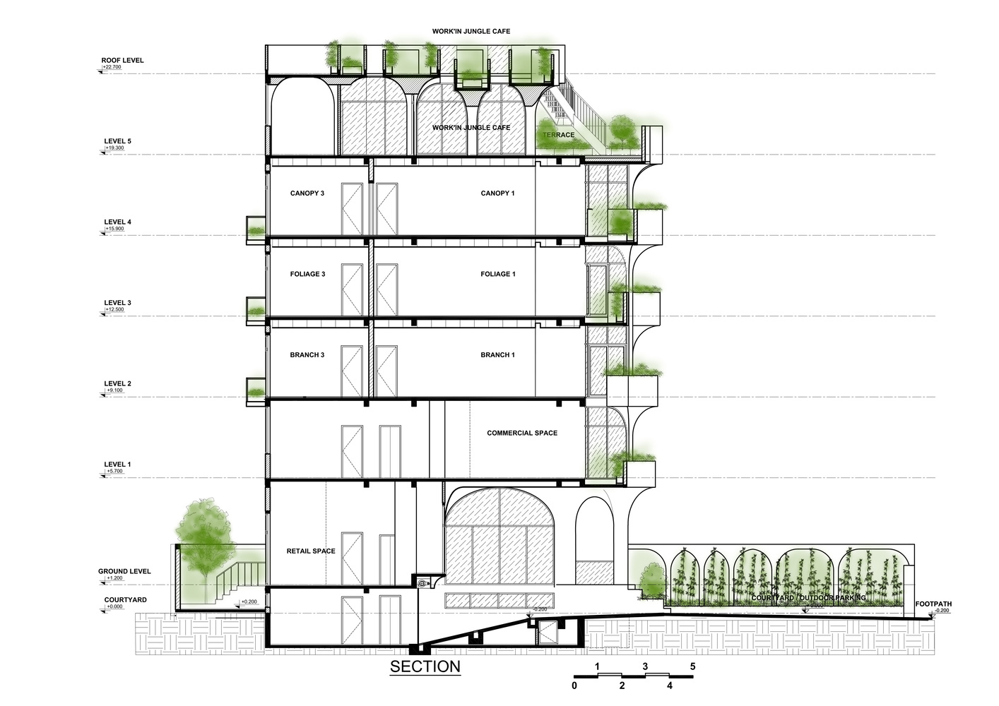 Tâm điểm của The Jungle là một ý tưởng thiết kế độc đáo – một khu rừng nhiệt đới bất ngờ phát triển mạnh mẽ giữa lòng thành phố. Nhiều ban công với hình dáng và kích thước đa dạng trải dài dọc theo mặt tiền, gợi nhớ đến sự ngẫu nhiên của thiên nhiên. Trong văn hóa Việt Nam, ban công không chỉ là một công cụ thẩm mỹ; chúng là không gian thiết yếu cho bóng mát, giao lưu và cuộc sống bên ngoài những bức tường. Tại đây, chúng trở thành những khoảng xanh – không gian cho cây xanh, những cuộc gặp gỡ và sự kết nối yên bình với thành phố. Những cột vòm, tấm kính cong, tông màu đất sét và vô số cây xanh đan xen vào nhau tạo nên một mặt tiền sống động, gợi lên sự tươi tốt của một khu rừng nhiệt đới.