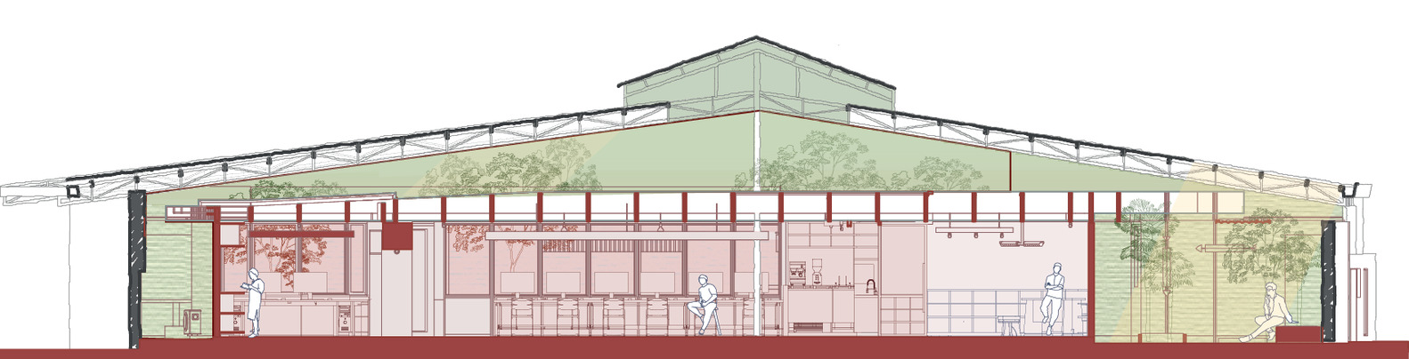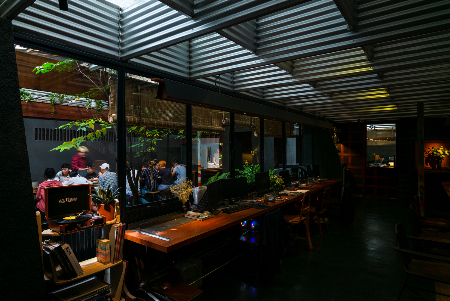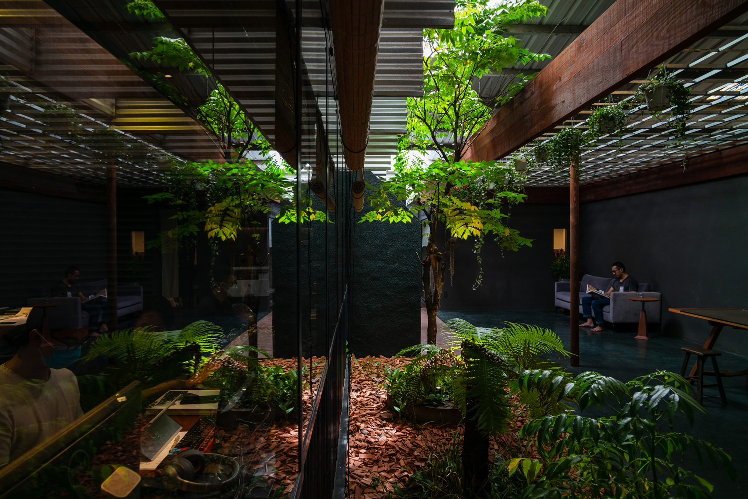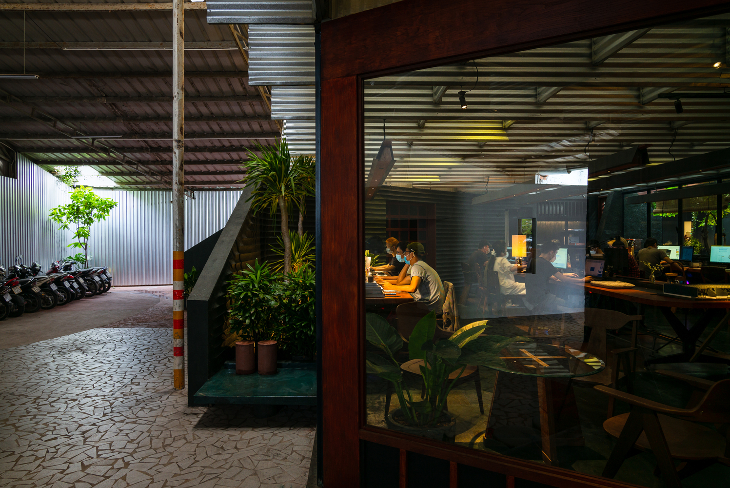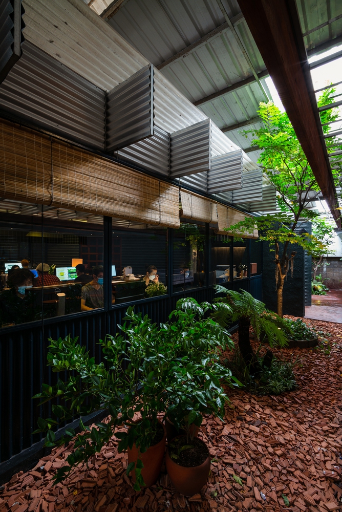 Bằng cách tạo ra khoảng hở giữa hai hệ thống mái, không khí lưu thông tự nhiên được kích hoạt, giúp giảm nhiệt độ của tòa nhà một cách hiệu quả, đặc biệt là trong thời tiết nóng nực giữa trưa. Không gian đệm này được hình thành không chỉ theo mặt bằng mà còn theo mặt cắt, cho phép nhân viên kết nối trực quan với cây xanh xung quanh. Ánh sáng mặt trời chiếu qua các lỗ hở trên mái tôn, được làm dịu đi nhờ lớp tôn kim loại đóng vai trò như một bộ khuếch tán, làm dịu đi ánh sáng chói chang của vùng nhiệt đới.