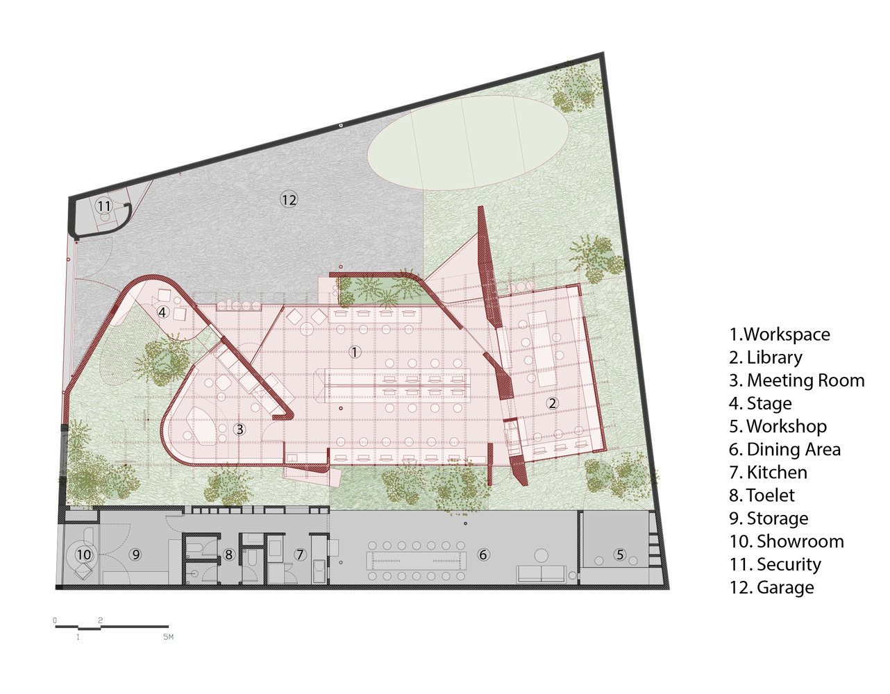 Cây xanh được đưa vào tòa nhà, với sự phát triển của chúng được đảm bảo bằng cách mở rộng các khu vực giếng trời và mở hoàn toàn mái nhà tại các điểm chiến lược. Được bao quanh bởi cây xanh, dự án trở thành một ốc đảo ẩn mình trong gara cũ, tạo thành các không gian ở giữa để đỗ xe, thể thao, sự kiện, ăn uống, v.v.