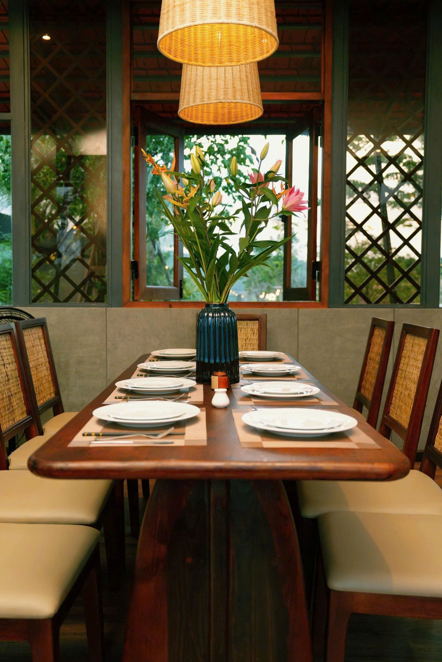 “Trong như ngoài, ngoài như trong” – Điểm ấn tượng nhất, cũng là linh hồn của căn Villa, chính là triết lý thiết kế xóa nhòa mọi ranh giới. Nhờ kết cấu khung thép vượt nhịp lớn, các kiến trúc sư đã thay thế hoàn toàn những bức tường gạch thô kệch bằng hệ vách kính Low-E tràn viền. Tại bất kỳ vị trí nào, từ quầy bar hay khu vực bida, gia chủ đều có thể chạm mắt vào màu xanh mát, mùi hương thơm nhẹ nhàng của cỏ cây. Ngôi nhà như một thực thể sống, hít thở cùng nhịp với vườn cây xung quanh.